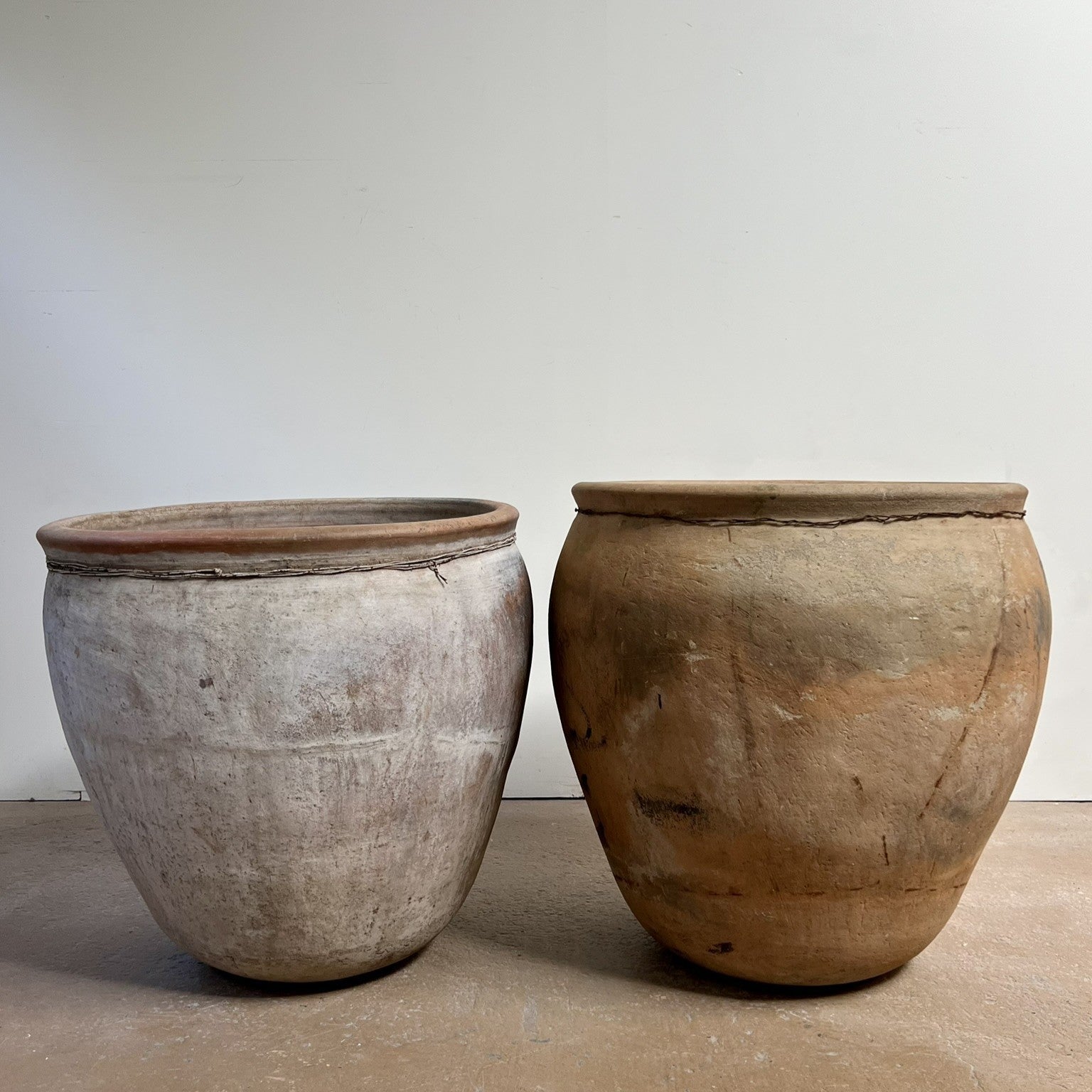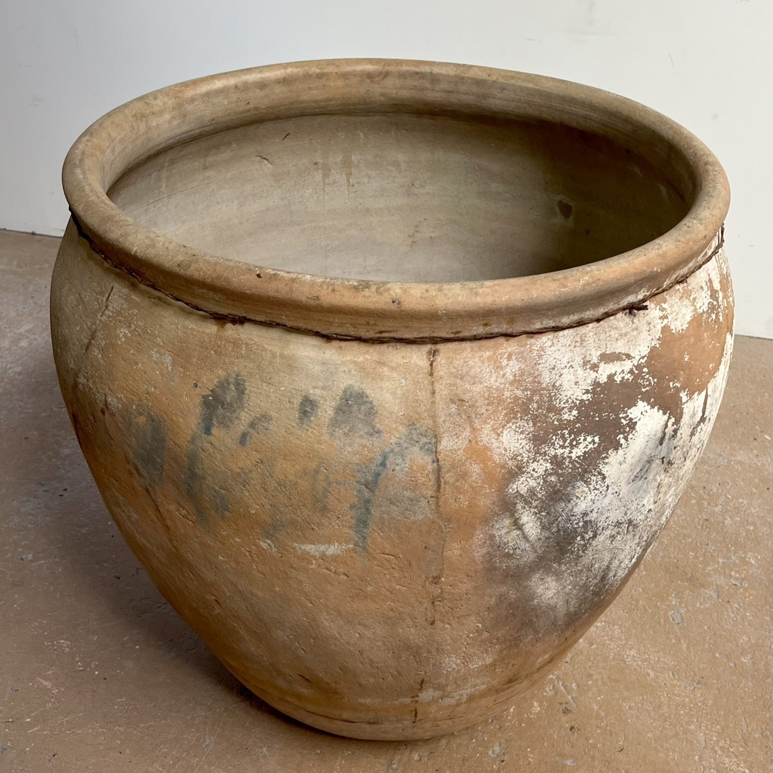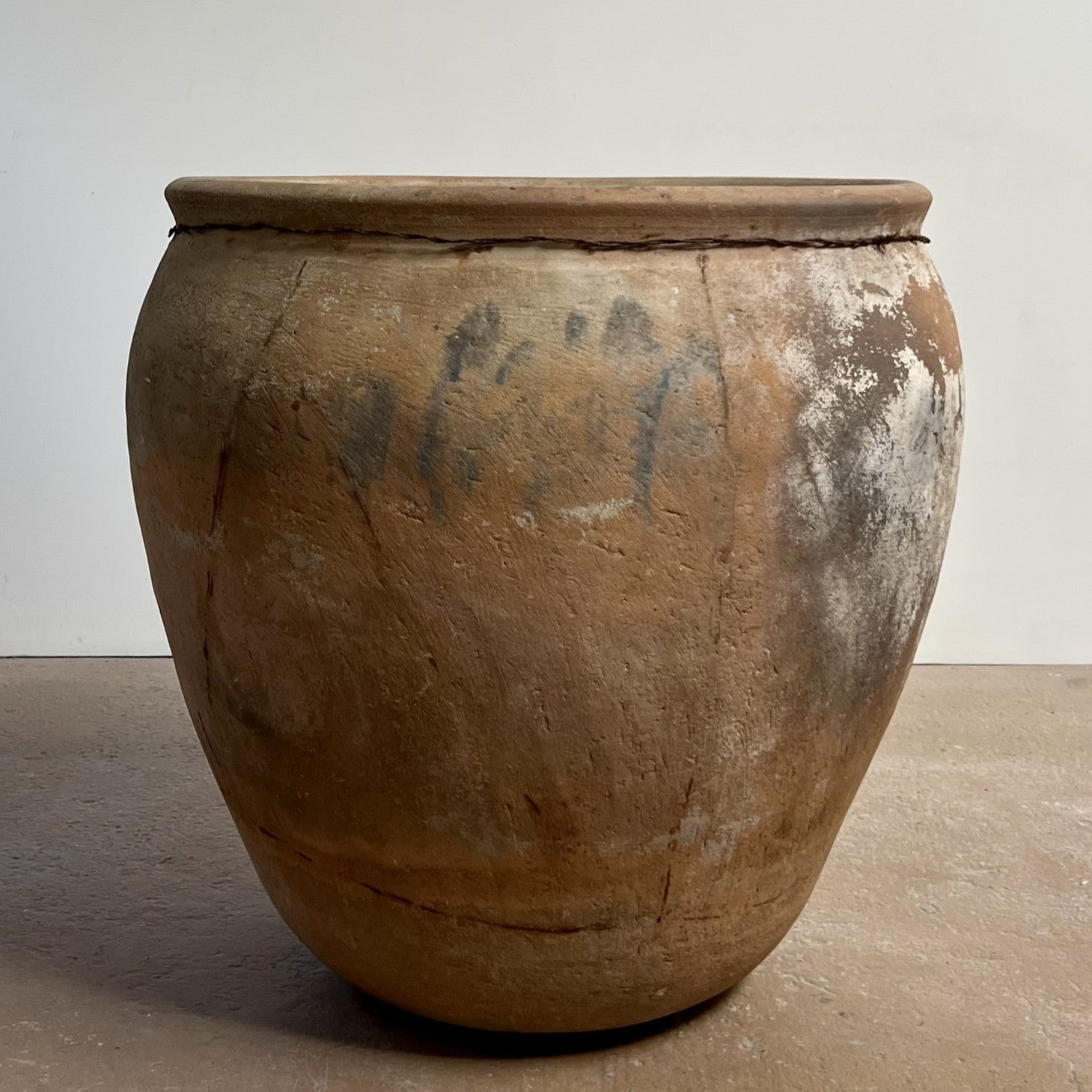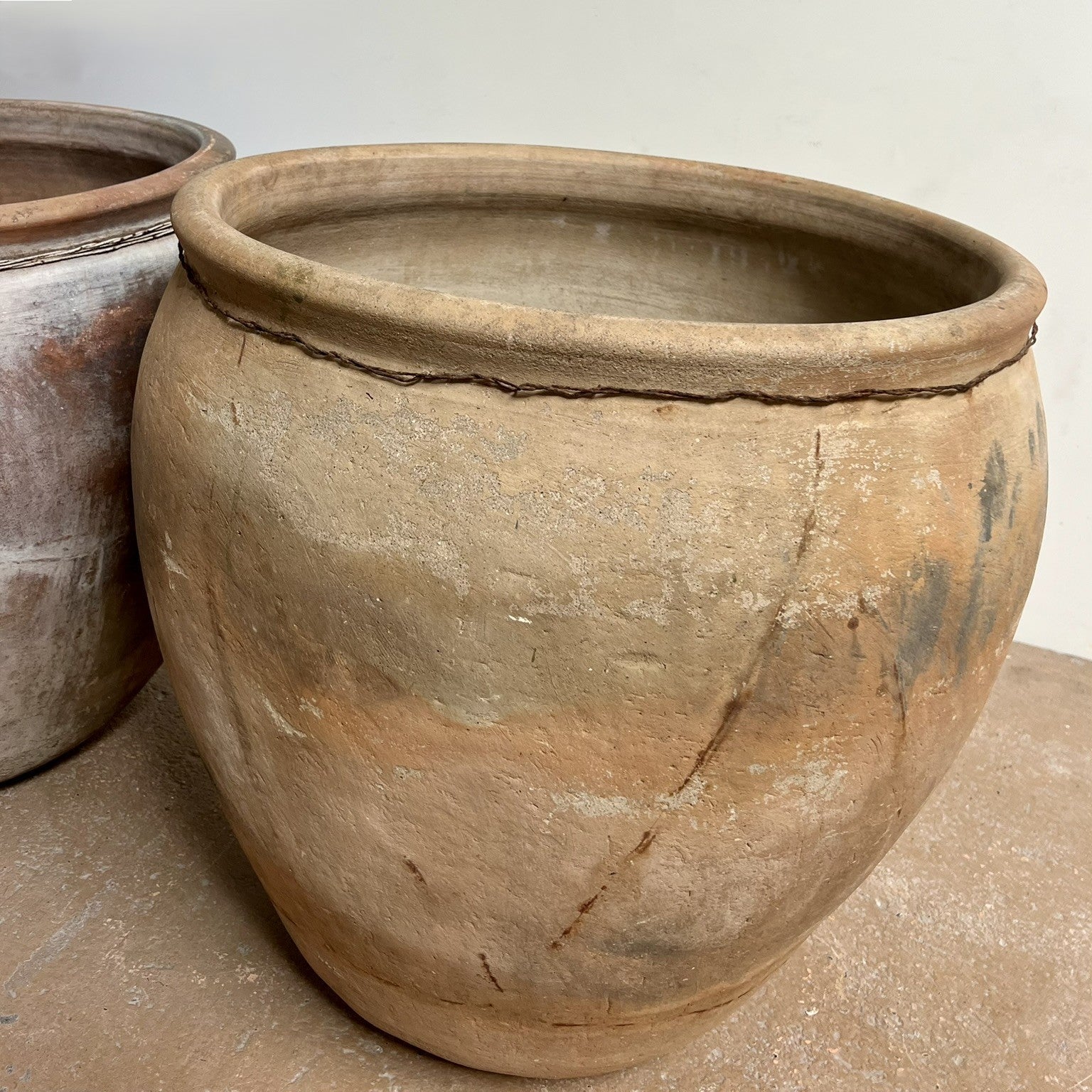 Vintage terracotta pot, wire detail.